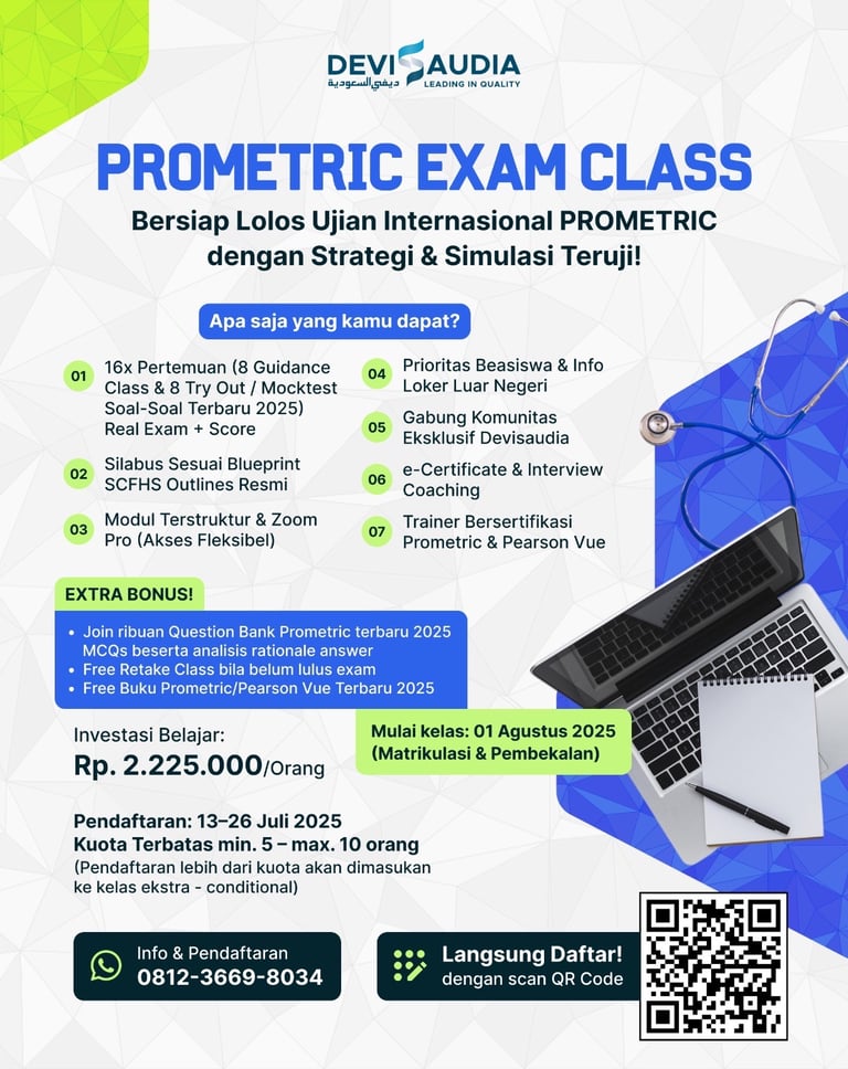 We offer a specialized review center for healthcare professionals preparing for Prometric and Pearson VUE exams. Our comprehensive support includes guidance for DataFlow processing, Mumaris registration, QCHP requirements, and exam preparation—available for test centers both in Saudi Arabia and Jakarta, Indonesia.